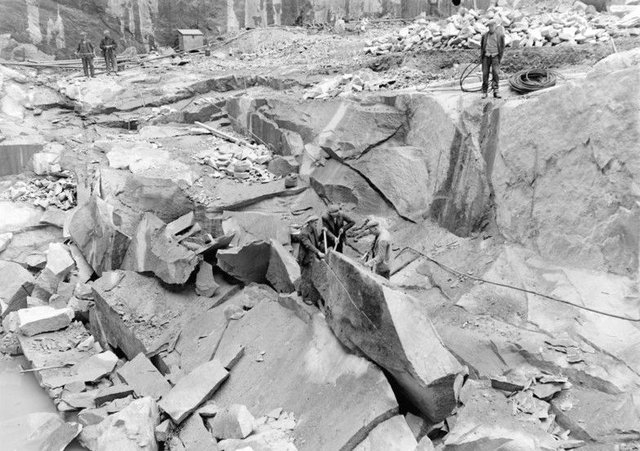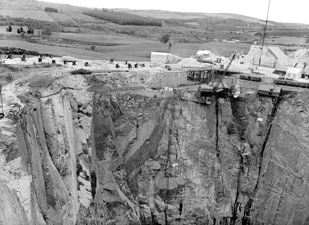 The above photograph shows a general view of surface working in grey muscovite-biotite granite. Shows pit-like form of quarry 122 m. deep. On the left of the photograph can be seen the sett-maker’s yard with the ‘scathies’ or huts set out at regular intervals, behind is the crushing plant. The various steel lattice towers are for the Blondins while below the crane on the pit edge are the ‘hutches’ for lowering the quarrymen to the bottom. The Blondin mast on the built-up platform just right of centre was called the ‘spion kop’ after a battle in Natal during the Boer War.