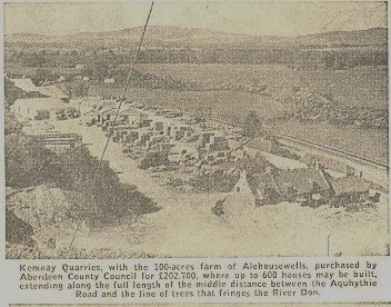 The village of Kemnay is surrounded by trees, and has a picturesque situation on the right bank of the Don. Down to 1858 it was considered “a paltry hamlet,” but the construction of the Alford Valley Railway and the opening of extensive quarries in the near vicinity brought it fresh and solid prosperity. It is now considered to be one of the finest and most prosperous villages in the county. The old buildings have been swept away and replaced by substantial, prettily-designed cottages and villas, arranged according to a carefully prepared feuing plan.